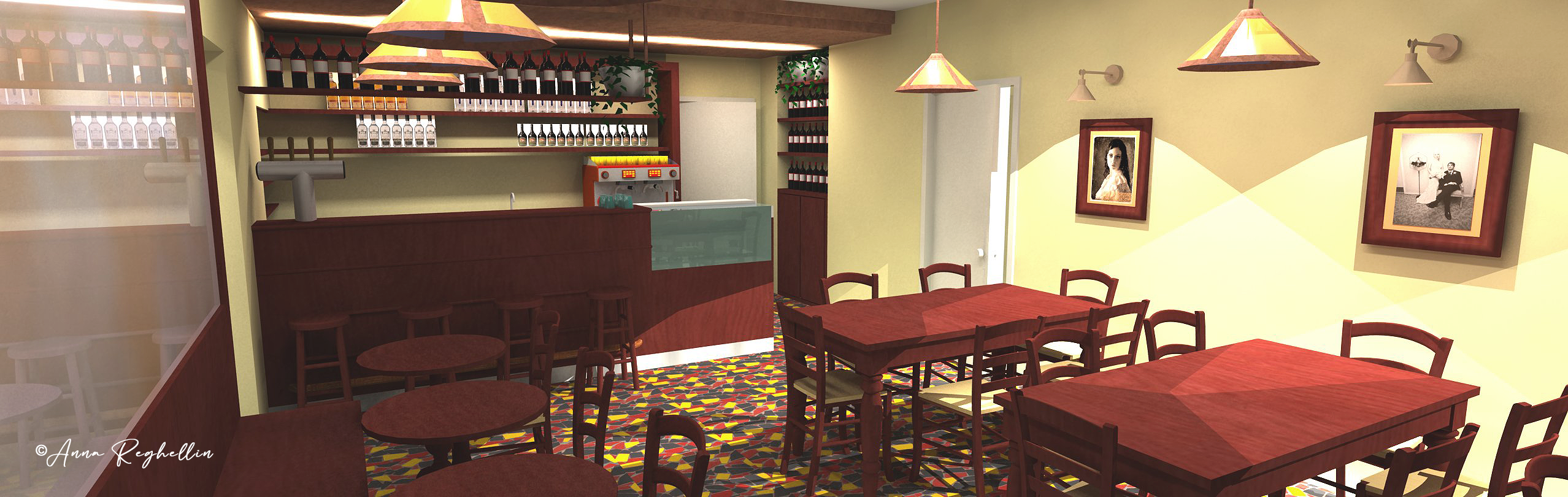 Progetto realizzato per la realizzazione di un bar con enoteca interna. Locale che riprende le linee delle osterie tradizionali, suddiviso in sala bar e saletta degustazione. Arredo disegnato su misura con l’aggiunta di complementi di arredi in stile.